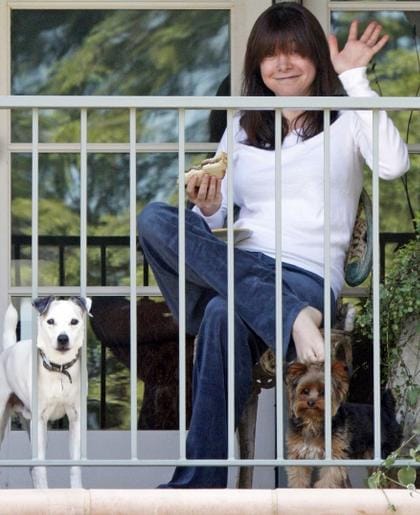 mulher lanchando sanduíche ao lado de dois cachorros